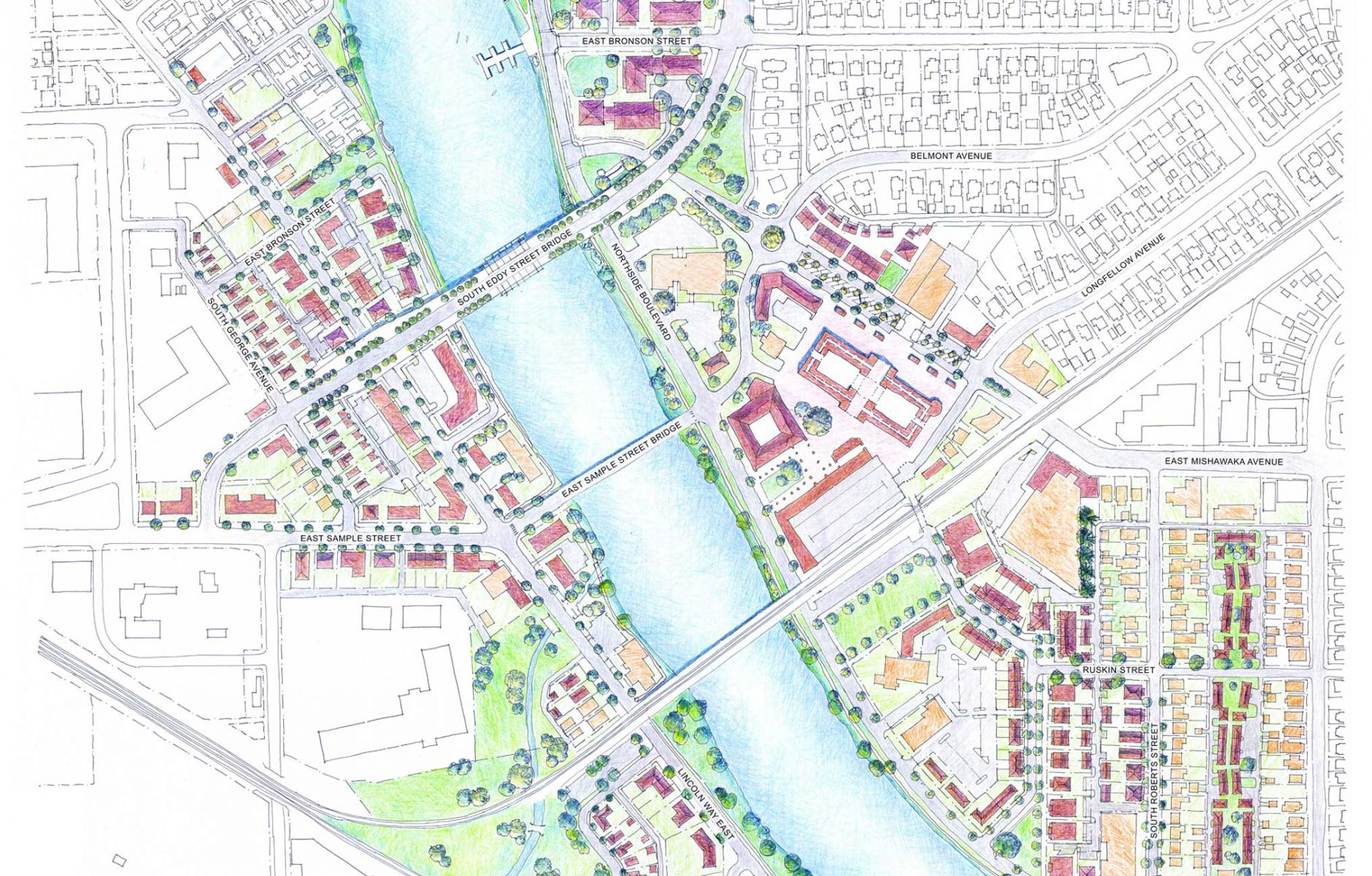 A design charrette and report sponsored by the City of South Bend focuses on the cloverleafs and the surrounding Farmers Market District. The work, organized by a Notre Dame team in 2021, met its immediate goal—the city recently garnered a $2.4 million federal grant for planning and engineering study of removal of the four cloverleafs and other access ramps, a substantial and fast return on planning investment.